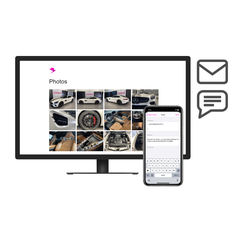 Vill kunden ha bilder via e-post, SMS, Whatsapp eller Skype? Det tar nu bara sekunder att dela stora mängder data direkt med kunden, något som allt oftare blir avgörande för att genomföra köp digitalt.
